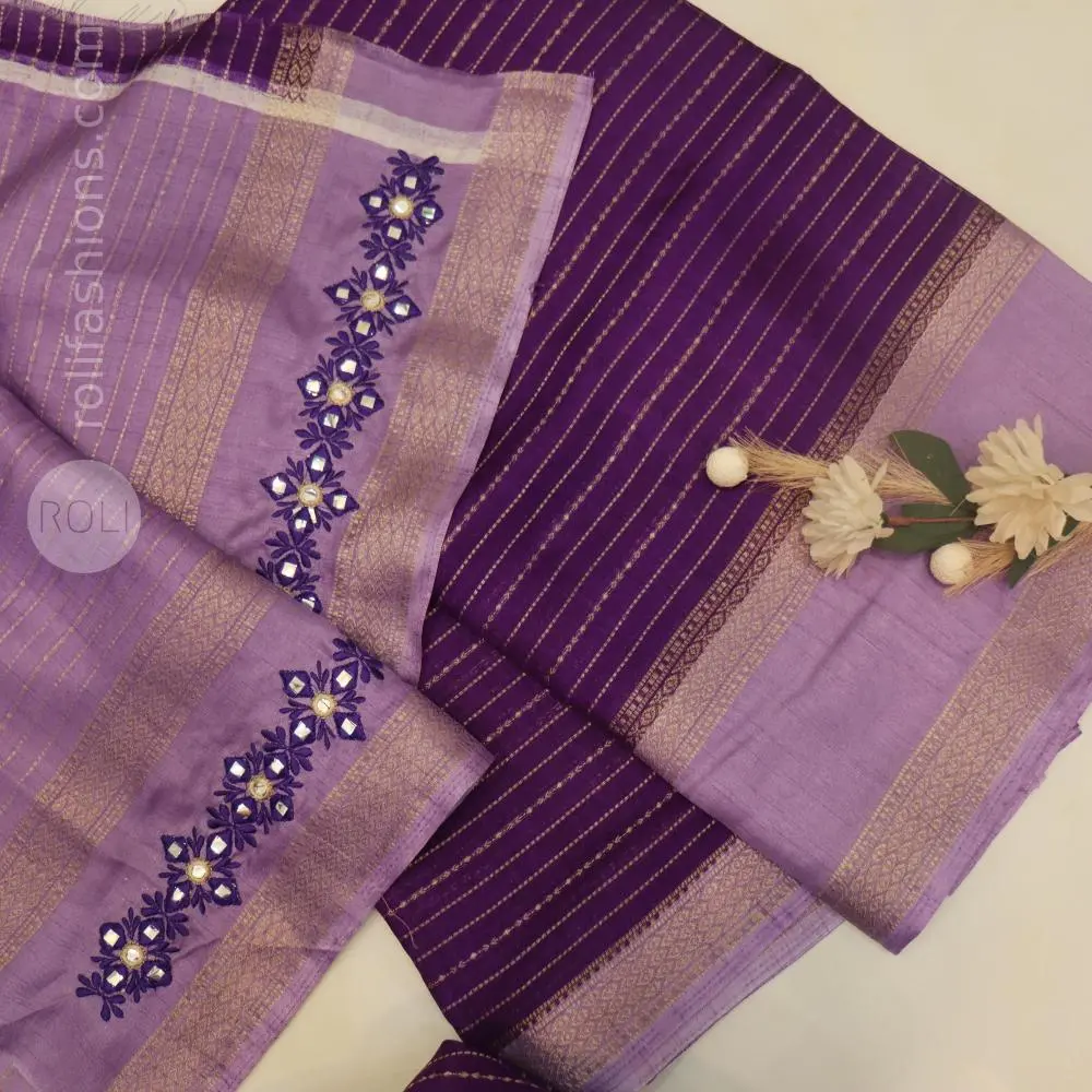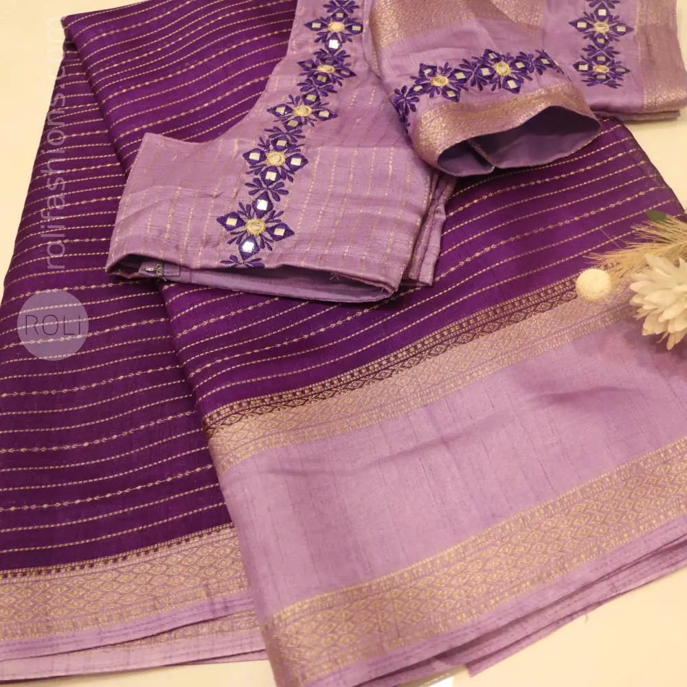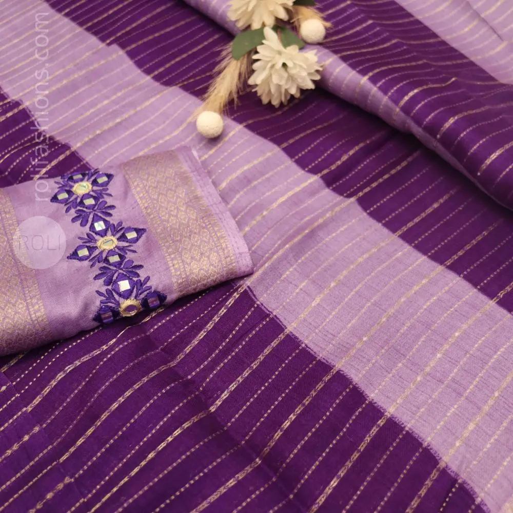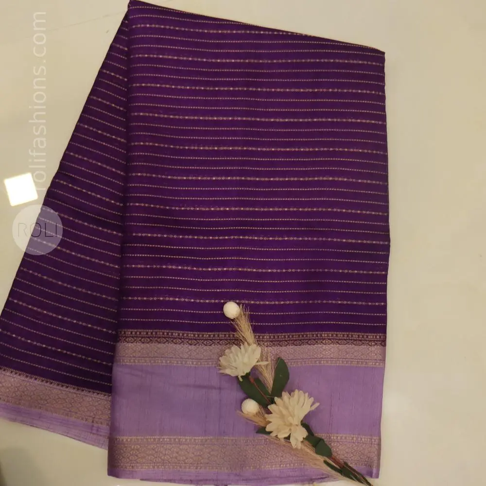 Elevate your everyday elegance with our Mysur Silk Saree. Crafted in a rich deep-purple base with fine gold stripes, this saree is paired with a beautifully coordinated lavender designer blouse. The blouse features intricate floral mirror embroidery with delicate thread work, adding a festive yet classy charm. Soft, breathable, and lightweight, this saree is ideal for office wear, poojas, small functions, and elegant day occasions. A perfect blend of comfort, tradition, and modern design. -