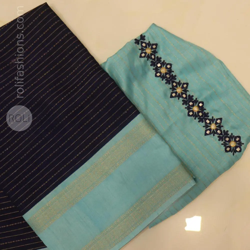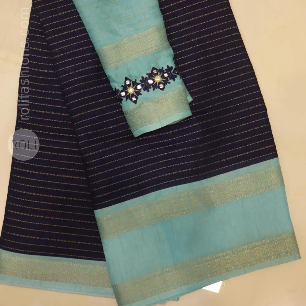Elevate your everyday elegance with our Mysur Silk Saree. Crafted in a rich deep-purple base with fine gold stripes, this saree is paired with a beautifully coordinated lavender designer blouse. The blouse features intricate floral mirror embroidery with delicate thread work, adding a festive yet classy charm. Soft, breathable, and lightweight, this saree is ideal for office wear, poojas, small functions, and elegant day occasions. A perfect blend of comfort, tradition, and modern design. - Navy Blue with light blue border