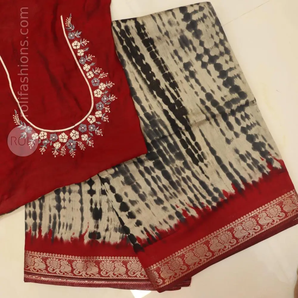 Elevate your ethnic wardrobe with this elegant PV Viscose saree, designed for women who love comfort blended with statement style. The saree features a graceful blend of earthy green tones with rich maroon accents, creating a naturally sophisticated look that suits both festive and semi-formal occasions. Paired with a fully curated designer blouse, this ensemble truly stands out. The blouse is crafted in a deep maroon shade and adorned with intricate floral embroidery along the neckline and sleeves, giving it a handcrafted, premium finish. The thoughtful detailing and perfect color harmony . Product Highlights: Fabric: Premium PV Viscose – soft, breathable & lightweight Saree: Elegant dyed pattern with rich contrast border Blouse: Fully designer blouse with detailed embroidery Fit & Feel: Comfortable drape, easy maintenance Occasion: Office wear, festive gatherings, casual functions A perfect choice for women who seek designer elegance at an affordable price, without compromising on comfort or style. -