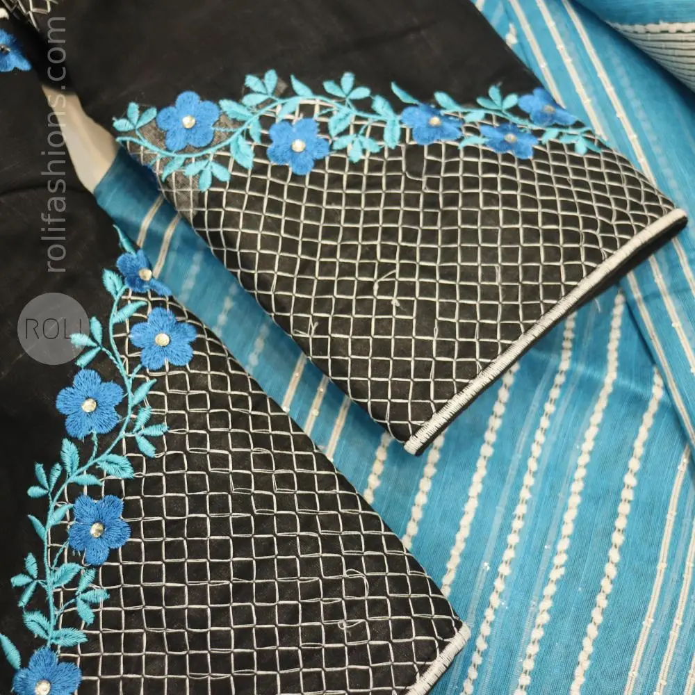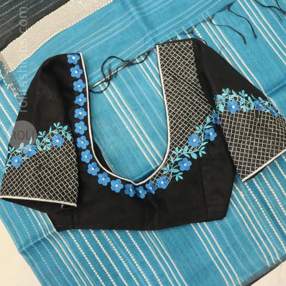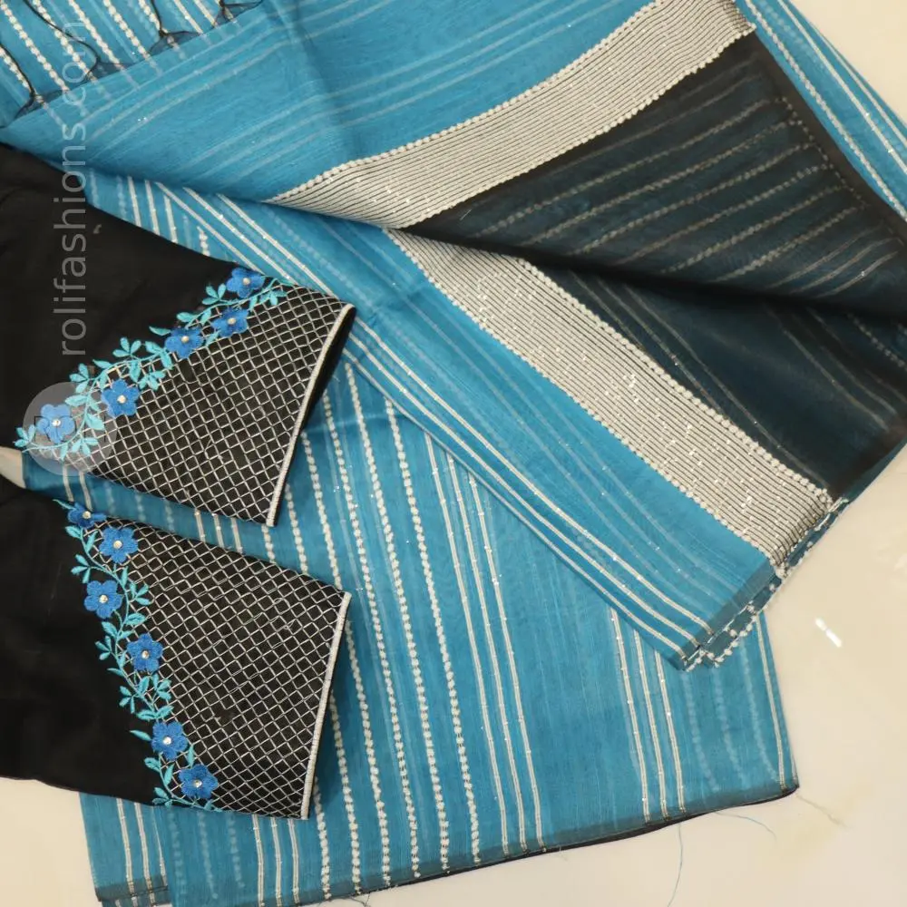 beautiful Raw Silk saree, crafted for women who love classic charm with a contemporary touch. The saree features a soothing teal-blue tone enhanced with delicate linear stripe weaving, giving it a refined and graceful appeal. The subtle contrast border adds depth and structure, making it perfect for both festive occasions and elegant everyday wear. Paired with a complete unstitched designer blouse, this set truly stands out. The blouse comes in a rich black base, highlighted with intricate blue floral embroidery along the neckline and sleeves. Fine detailing and contrast piping elevate the blouse, offering a designer finish that complements the saree effortlessly. 🌿 Saree Highlights Premium Raw Silk fabric with natural texture Elegant stripe weave for a timeless look Soft yet structured drape Classy contrast border for a polished finish 👗 Designer Blouse Details Complete unstitched blouse piece Rich black fabric with detailed blue floral embroidery Designer neckline and sleeve patterns -
