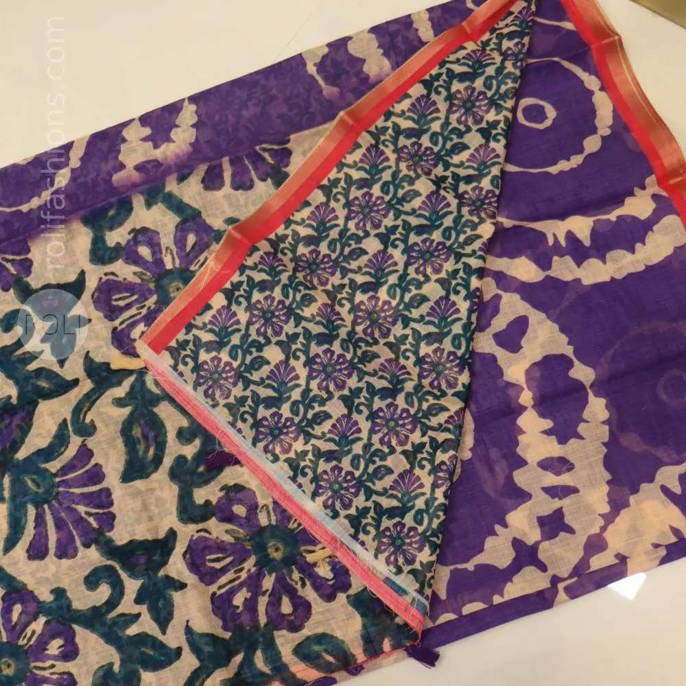Purple Linen Cotton Saree with Artistic Prints & Designer Blouse Add a touch of artistic elegance to your wardrobe with this beautiful linen cotton saree, designed for comfort and effortless style. The saree features a rich royal purple base adorned with striking abstract patterns that create a bold yet graceful look. The soft linen cotton fabric ensures excellent breathability and a lightweight drape, making it perfect for all-day wear. A vibrant coral-pink zari border enhances the beauty of the saree, giving it a subtle festive charm while still being ideal for daily elegance. The highlight of this ensemble is the beautifully curated designer blouse fabric, featuring delicate floral prints in purple and teal tones on a soft base. This contrast blouse perfectly complements the saree and adds a unique designer touch. ✨ Key Features Premium linen cotton fabric Soft, breathable and lightweight Elegant abstract artistic prints Beautiful coral pink zari border Designer floral printed blouse fabric Easy maintenance and comfortable drape Ideal for office wear, casual outings, and small gatherings This saree blends comfort, creativity, and contemporary elegance, making it a perfect choice for women who love stylish yet practical fashion. -