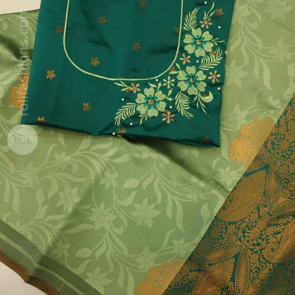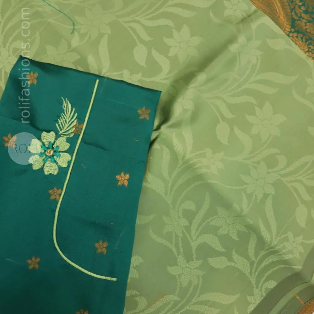 Step into timeless elegance with this beautifully curated semi kanchi silk saree and blouse set, crafted to bring out grace and sophistication in every drape. 🌿 Saree Highlights Rich saree adorned with subtle self floral weaving for a classy, textured look Accented with elegant golden motifs that add a touch of traditional charm Finished with a stunning contrast pallu in a soft rose-gold tone featuring intricate zari patterns Lightweight and graceful, perfect for festive occasions, office wear, and special gatherings 🌸 Designer Blouse Premium blouse with a soft sheen for a luxurious feel Beautiful -embroidered floral designs in vibrant threadwork Enhanced with delicate pearl embellishments for added elegance Stylish neckline and sleeves that perfectly complement the saree 💖 Style Statement A perfect blend of subtle tradition and modern elegance, this anchi silk saree set is ideal for women who love understated beauty with artistic detailing. Pair it with minimal jewelry for a refined and graceful look. -