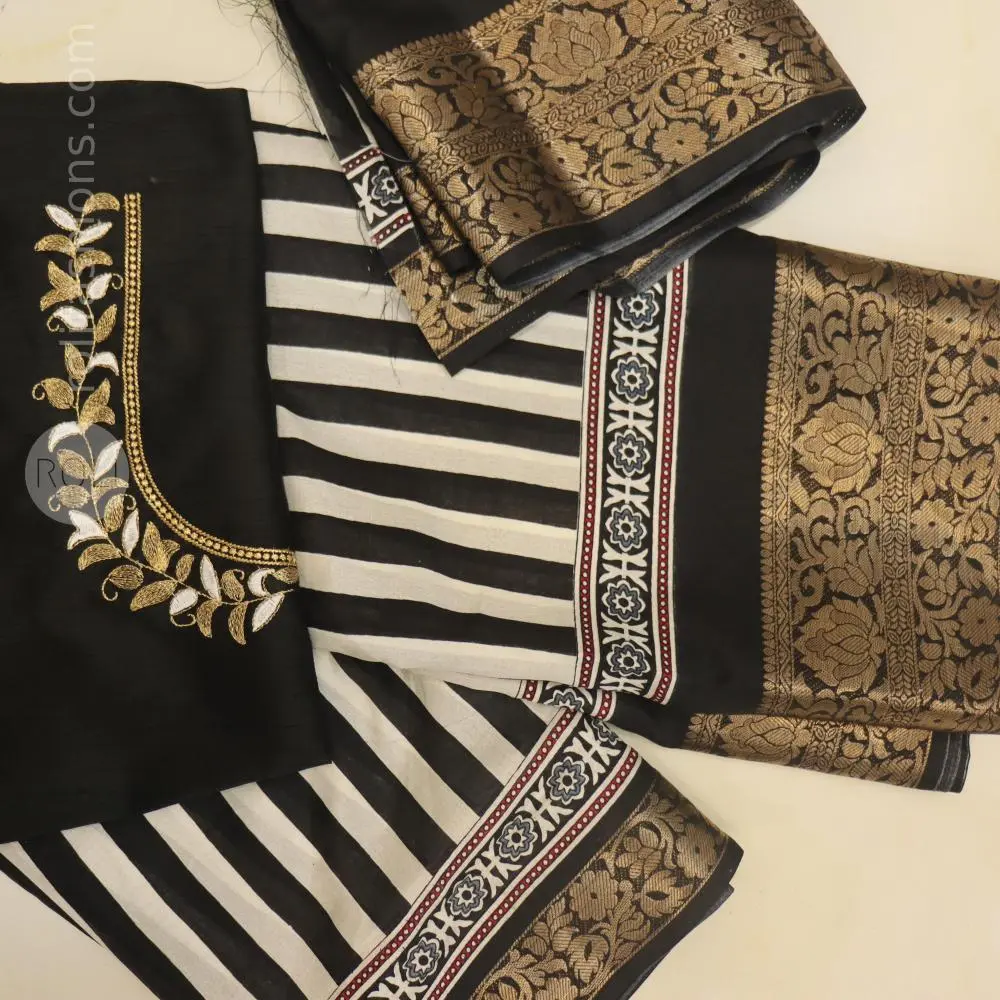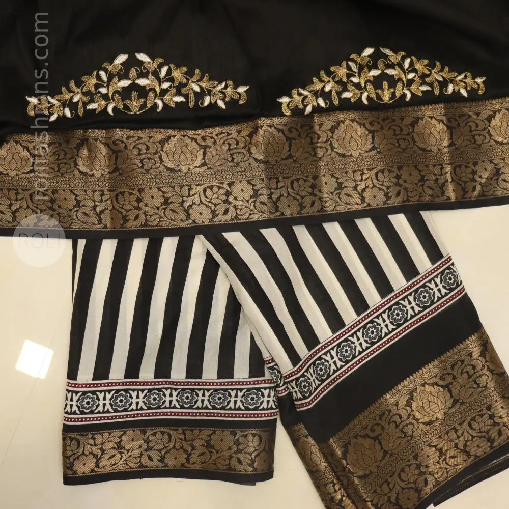 This saree is a striking blend of bold contrast and traditional elegance, perfect for making a statement. The body features classic black and off-white vertical stripes, A sister of modal ,giving it a timeless and slightly contemporary appeal. This monochrome base beautifully highlights the rich red borders, which are adorned with intricate gold zari floral weaving, adding a luxurious festive touch. The pallu is the highlight of the saree, showcasing detailed artistic motifs—elegant elephant patterns paired with decorative elements and bold circular accents, all set against the vibrant red base. This gives the saree a unique fusion of traditional storytelling and modern design aesthetics. The blouse is a standout piece in itself—crafted in a rich red fabric with exquisite gold and subtle white thread embroidery around the neckline in a graceful leafy pattern. The sleeves are enhanced with traditional zari work, perfectly complementing the saree’s border. Overall, this saree is a beautiful mix of bold stripes, heritage motifs, and festive richness—ideal for special occasions, cultural events, or when you want to stand out with elegance and confidence. -