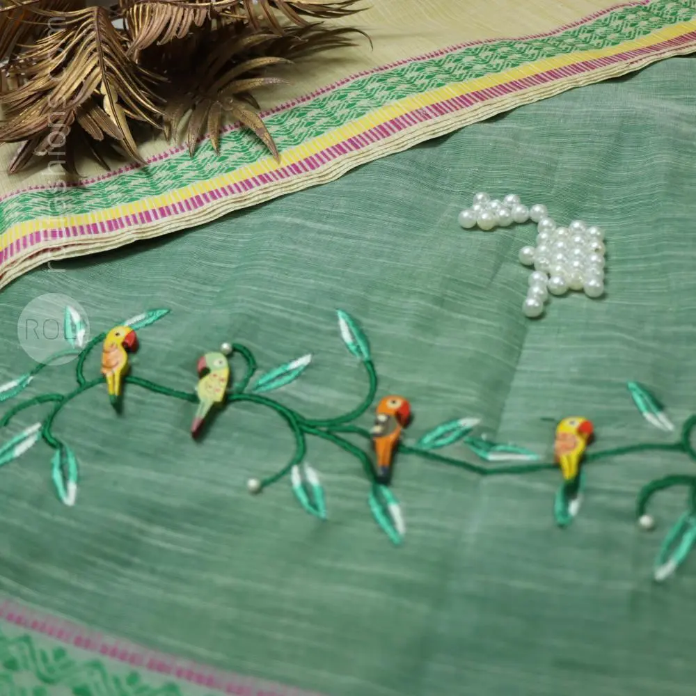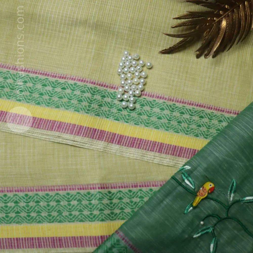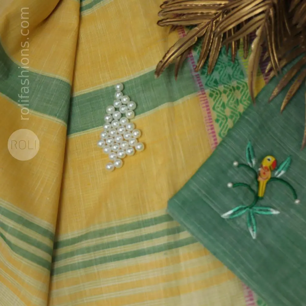 Mivak cotton sarees paired with an embroidered blouse offer a fusion of traditional grace and modern allure. The lightweight cotton fabric drapes beautifully, while the intricate embroidery on the blouse adds a touch of sophistication. This ensemble embodies timeless elegance, perfect for various occasions with a hint of cultural charm. - Mustard and Grass Green