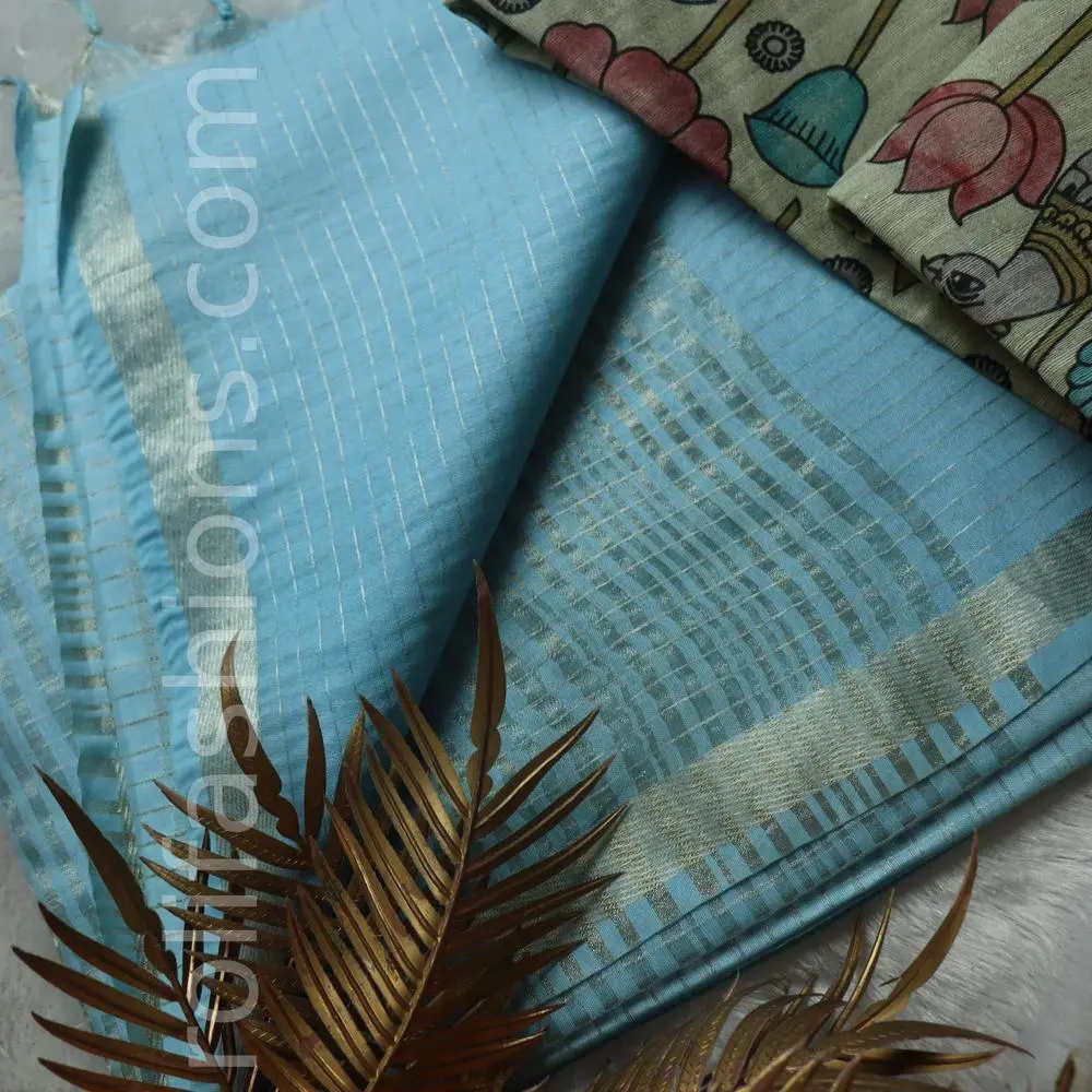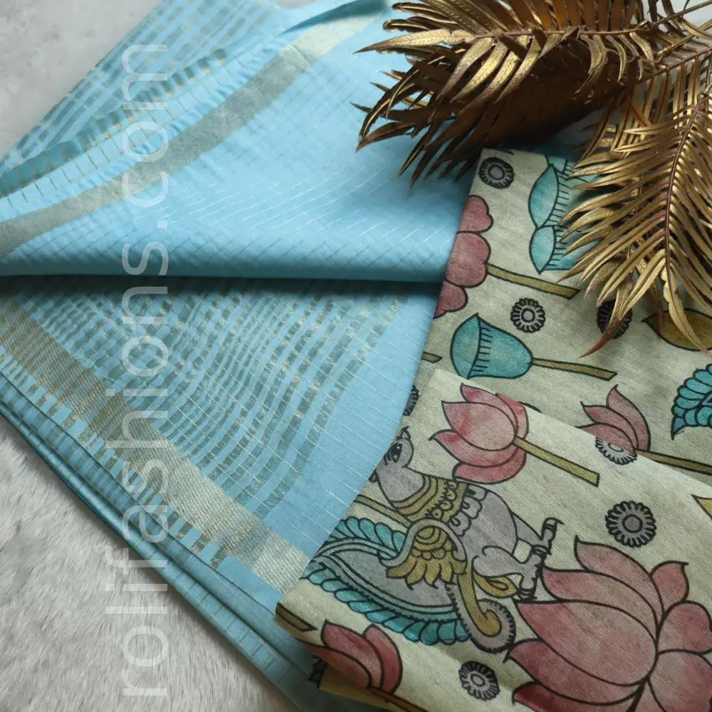 Raw silk sarees with raw silk printed blouse - Electric blue saree with printed blouse