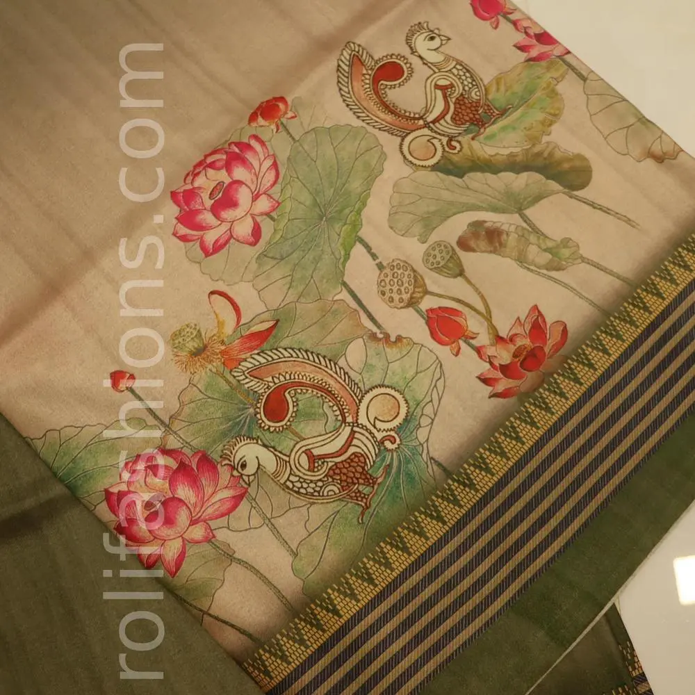 Our Mulberry Tussar Saree in elegant digital prints, crafted to bring together luxury, comfort, and modern style. The soft mulberry-tussar blend gives a smooth drape with a natural sheen, while the vibrant digital prints add a touch of contemporary charm. It comes paired with an executive printed blouse, designed to enhance the saree’s premium look and make it perfect for office wear, gatherings, festive evenings, or classy day events. A refined outfit that blends tradition with modern sophistication,a must-have addition to your wardrobe, available only at Roli Fashions. -