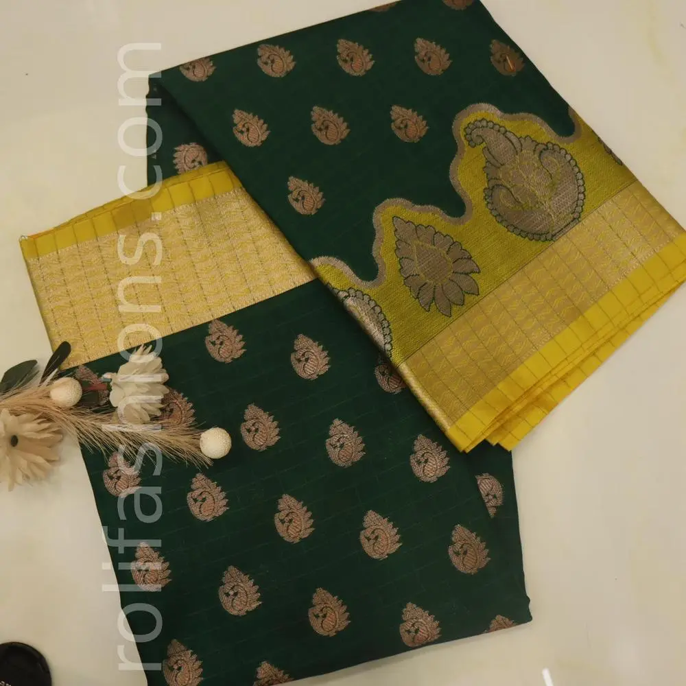 Presenting an elegant green Banarasi saree highlighted with a classic yellow border for a striking contrast. The saree features trendy mango motifs intricately woven across the body, giving it a timeless yet fashionable appeal. The ensemble includes a jacquard weaving blouse and pallu, crafted to enhance the rich traditional look. The blouse sleeves are specially designed with fine thread work that perfectly matches the saree’s body colour, adding a touch of sophistication and handcrafted beauty. A graceful choice for celebrations, functions, and special moments—tradition meets trend at Roli Fashions. -